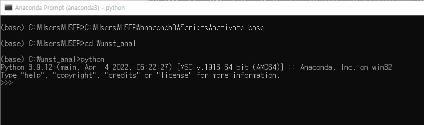 내용을 참조하여 anaconda prompt 상태에서 c:\Anaconda3\Scripts\activate base를 실행시킨다.