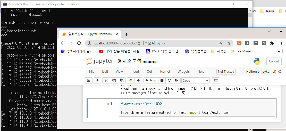 Anaconda3 CLI(Anaconda Prompt)에서 jupyter notebook을 실행시켜야 한다.